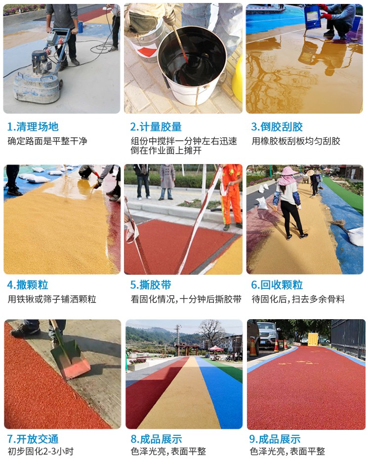 彩色防滑路面的優(yōu)點:防滑性能高,路面散水性好,色彩鮮艷;施工快速容易,鋪設(shè)效率高。特別配制的粘合劑固化快:速固化保證了持續(xù)施工,重新開放公路所需的時間大大減少;減少工作場地面積:比其他解決方案可省一半費用;降低噪音:用骨料做成的精細結(jié)構(gòu)有傳導(dǎo)音頻的效果,在水泥路面上使用可以將噪音降低;減少剎車距離:優(yōu)良的防滑性能減少40%的剎車陸離,此外重型卡車在轉(zhuǎn)彎處剎車不會產(chǎn)生抱死現(xiàn)象;最小的厚度:設(shè)計厚度為3-5mm,無須調(diào)整街道設(shè)施,也不影響排水;色彩鮮艷、可根據(jù)客戶要求提供顏色;用于交通減速帶時有很好的視覺和聽覺效果。